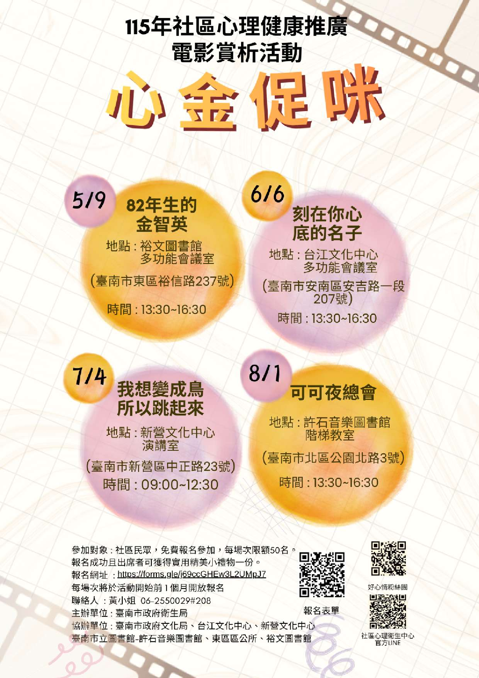 臺南市政府衛生局辦理115年社區心理健康電影賞析「心‧金促咪」活動,期透過電影賞析,以多元主題讓民眾學習如何面對生命的失落,激發轉念動機、轉換負面情緒為動力,適時抒發心理壓力,以維持心理健康,歡迎民眾踴躍參加! 活動相關訊息請詳閱活動文宣