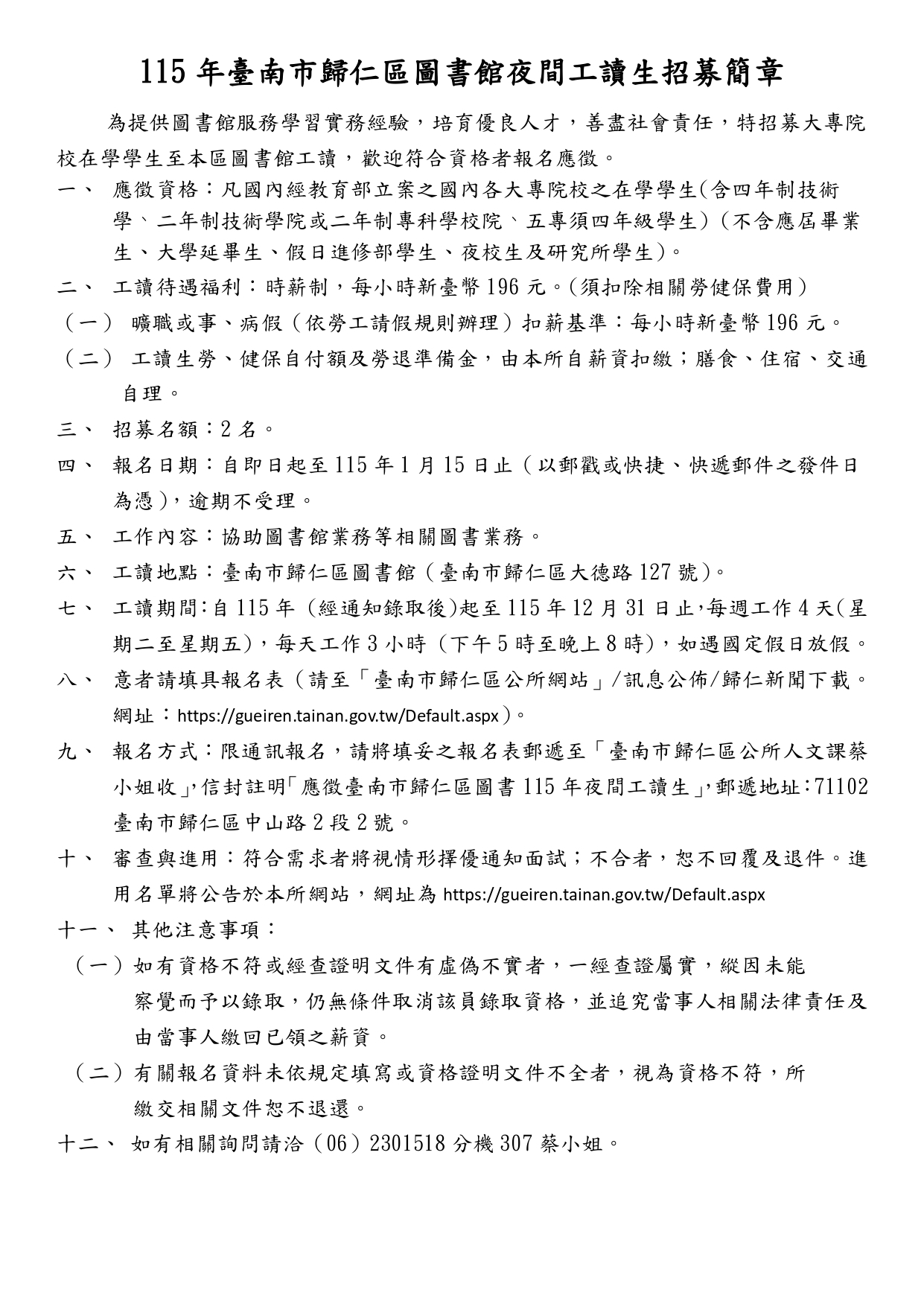 👉延長報名日期:即日起至115年1月15日止。(以郵戳或快捷、快遞郵件之發件日為憑),逾期不受理。 👉詳細訊息請下載並參閱報名簡章檔案。 👉意者請填具報名表 承辦人:人文課 蔡小姐 聯絡電話:2301518#307
