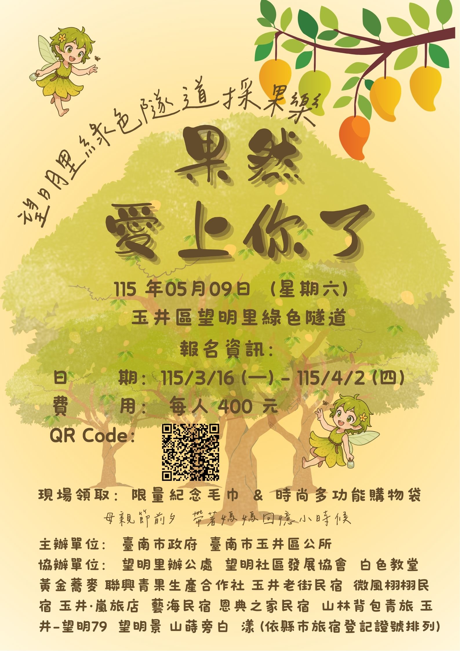 2026年臺南市玉井區望明里綠色隧道採果樂「果然愛上你了」 每年四到五月土芒果成熟時,漫步臺南市玉井區望明里綠色隧道,可以見到顆顆飽滿的青色土芒果,居民大多用來製作芒果青,酸酸甜甜的味道被比喻為戀愛的感覺。臺南市玉井區公所開放望明里綠色隧道提供遊客採土芒果,現場教學製作芒果青,一同愛 ...更多