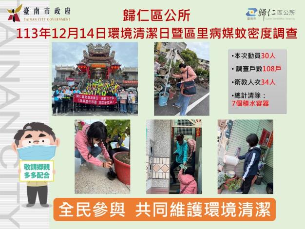 為響應及支持臺南市環境清潔日,本區在林育嬪主任秘書的帶領下,於12月14日(星期六)上午,辦理環境清潔日暨區里病媒蚊密度調查活動。動員各里及社區環保義工隊進行環境清潔及登革熱病媒蚊孳生源清除作業,藉由全民參與來共同維護住家環境整潔,創造無蚊宜居家園。