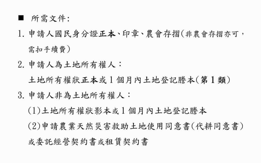 申期期間:自114年7月8日起至7月21日止(工作日受理)。 受理窗口:土地所在地區公所 救助對象應符合下列規定: 1️⃣符合本辦法第五條規定之農民。 2️⃣辦理救助項目損害率達20%以上者,依救助額度予以救助;未達20%者不予救助。 3️⃣短期作農產品於同產季,救助以一次為限。