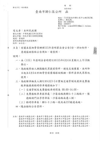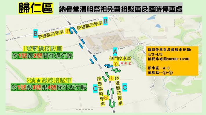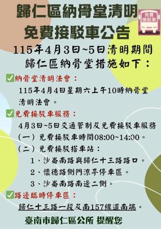 歸仁區納骨堂清明免費接駁車公告 ⭕️115年4月3日~6日清明期間歸仁區納骨堂措施如下: ✅納骨堂清明法會: 115年4月4日星期六上午10:00清明法會 ✅免費接駁車服務: 4月3日~5日交通管制及免費接駁車服務 (一)免費接駁車時間08:00~14:00 (二)免費接駁搭車站: 1、沙崙南路與歸仁十三路路口 2、懷德路側門涼亭停車區 3、沙崙南路南邊二側 ✅路邊臨時停車區: 歸仁十三路一段及南157線道南端 ✅納骨堂停車位有限,敬請共乘或騎機車。 ✅為避免人潮及交通壅塞,請提前於3/30日-4/2日掃墓祭祖避車潮。 ✅「四不二記得」原則: ❌除草不用火 ❌紙錢不燃燒 ❌爆竹不燃放 ❌菸蒂不亂丟